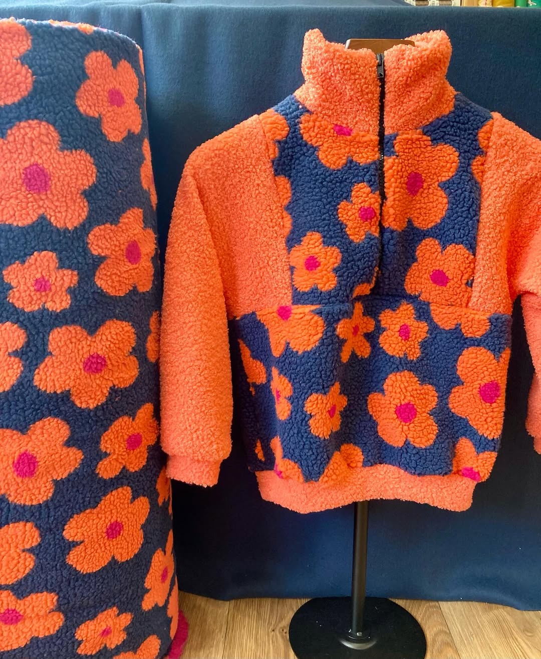 Elle l’a cousu dans notre sherpa à fleurs associée à une autre sherpa orange doublée polaire pour encore plus de confort et de chaleur.